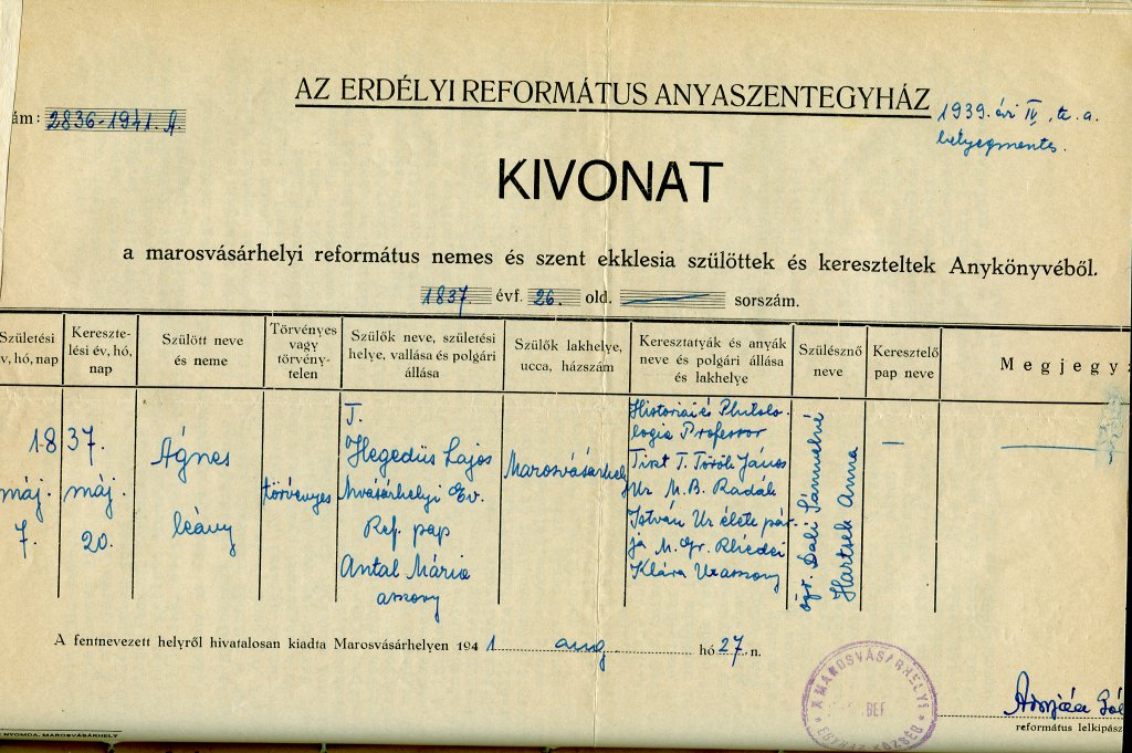 Hegedűs Ágnes születési anyakönyvi kivonat