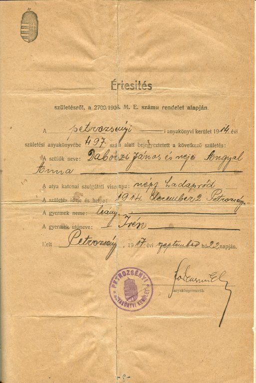 Dabóczy Irén születési anyakönyvi kivonat